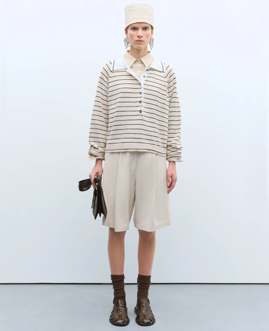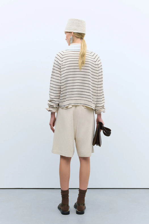 A stylish oversized polo with a classic buttoned polo collar. Features brown stripes on an ecru background, accented with a contrasting white collar and black stripe detail that matches the striped cuffs. Small side buttons add a charming touch to this versatile piece, perfect for relaxed yet polished outfits.