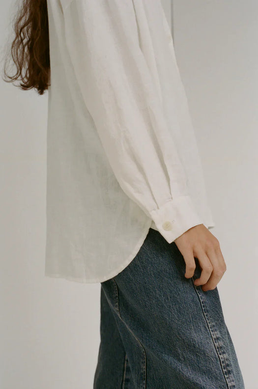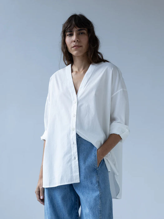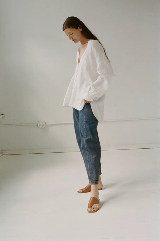 The Studio Shirt is an oversized button down blouse taking cues from our favorite menswear shirts. Featuring a clean finished V neck front with deep back pleat for a soft and beautiful silhouette. This crisp and softly structured shirt has a menswear inspired shirting hem and cuff with pleat and button.