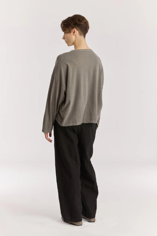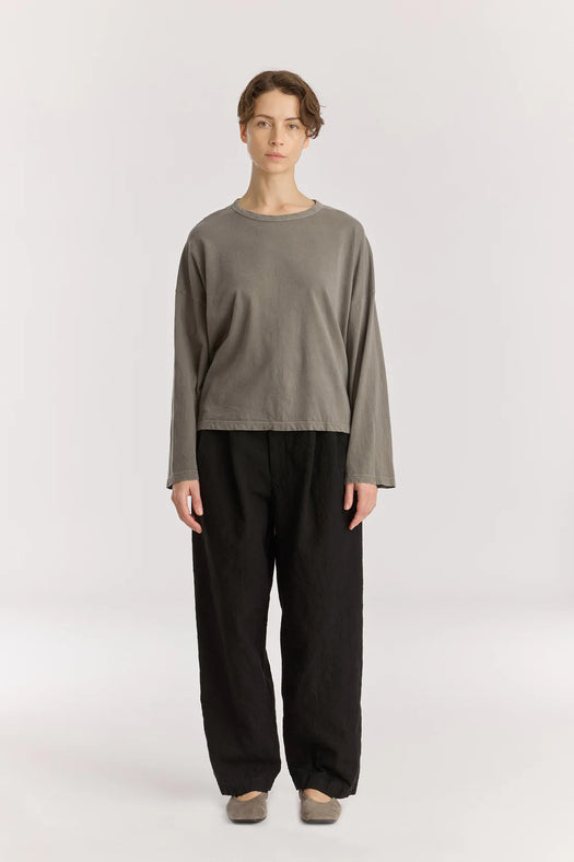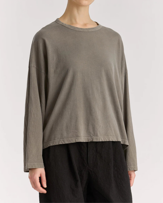 A basic crew neck long sleeve in soft organic cotton. Features a self binding edge, boxy silhouette, slightly dropped shoulders. Relaxed fit.