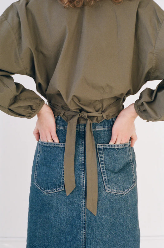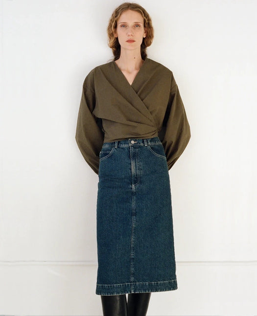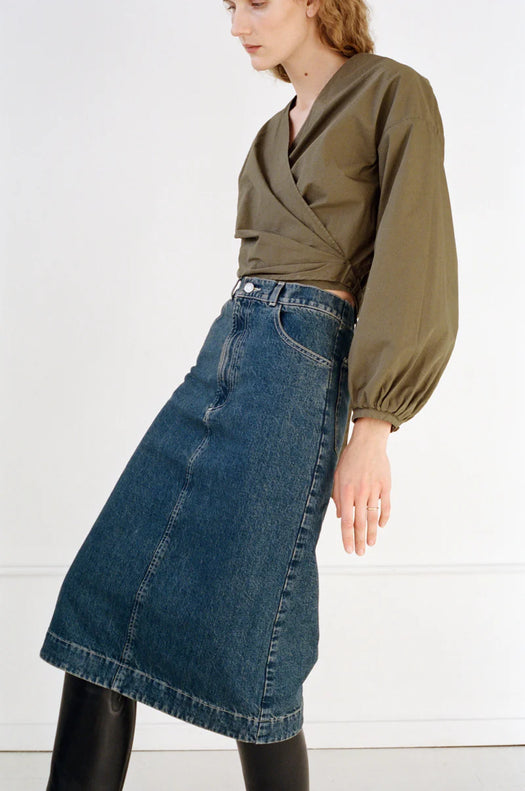 The skirt of the season, the midi, with a timeless workwear inspired edge. Features an A-line shape with 5 pockets and wide hem. Front tack button and zip fly.