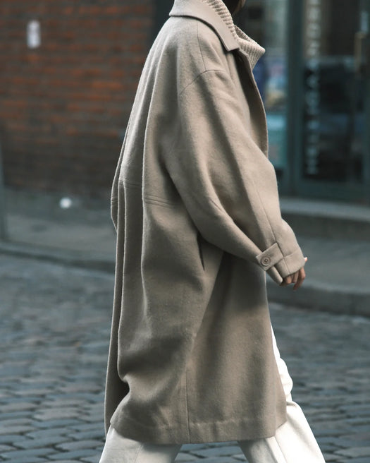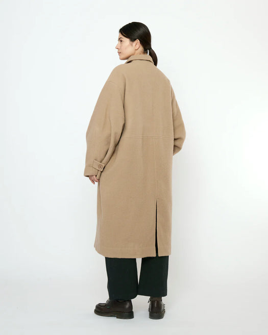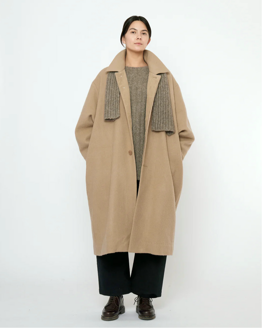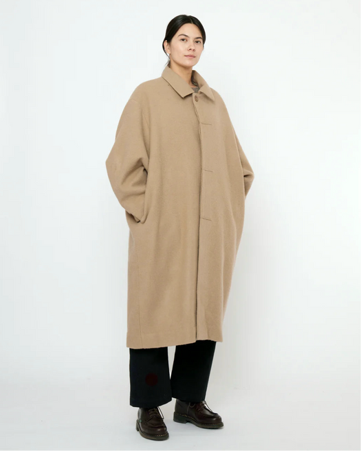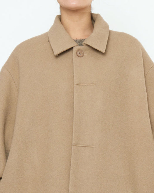 A mid-length coat cut in a boxy cocoon silhouette for comfortable layering. Features a spread collar, dropped shoulders, exaggerated sleeve cuffs, and a single back vent. Button closure is embroidered with line detailing and underlined with wale corduroy. A sleek and minimal design with in-seam side pockets.