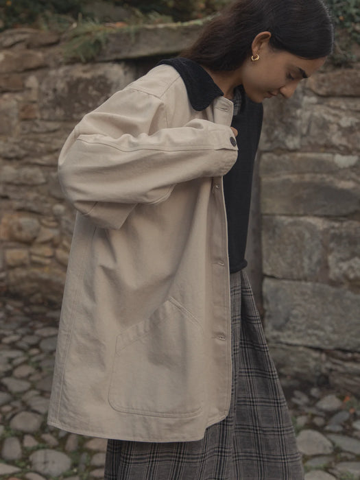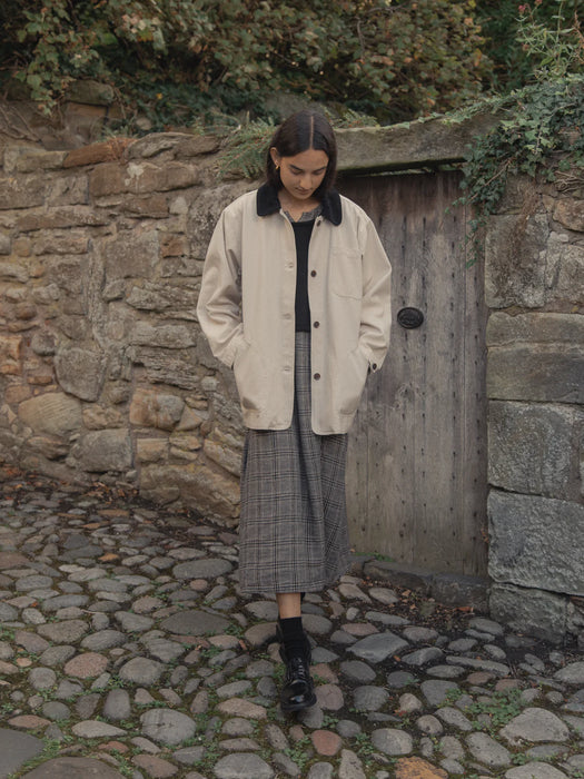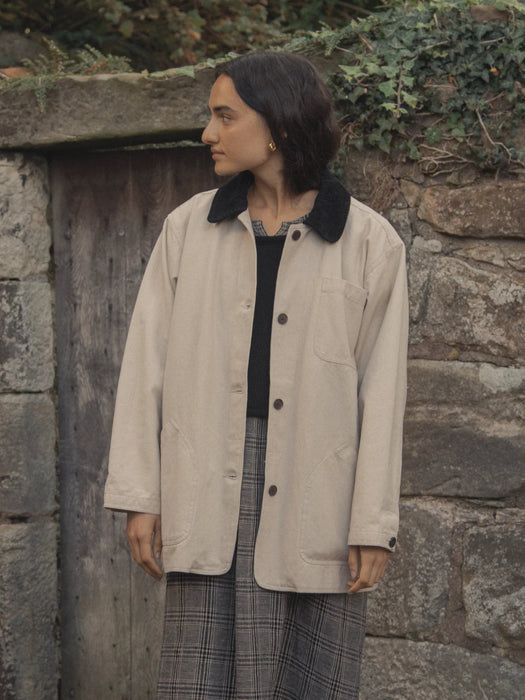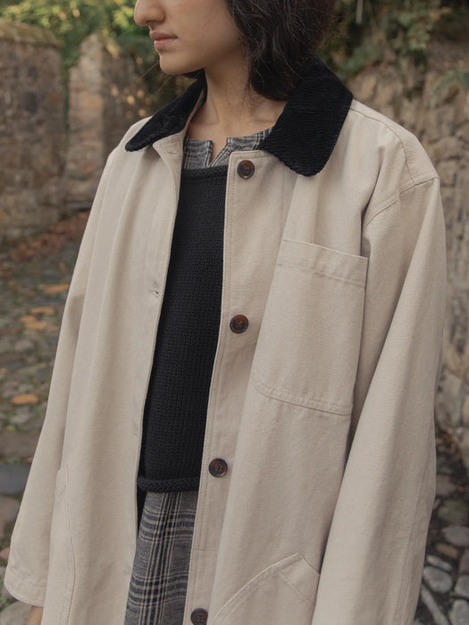 The Milo Jacket is a vintage inspired field coat in a heavyweight organic cotton canvas with a corduroy collar. Featuring large patch pockets. Fully lined in organic cotton, making it a substantial outer layer for the cooler months.