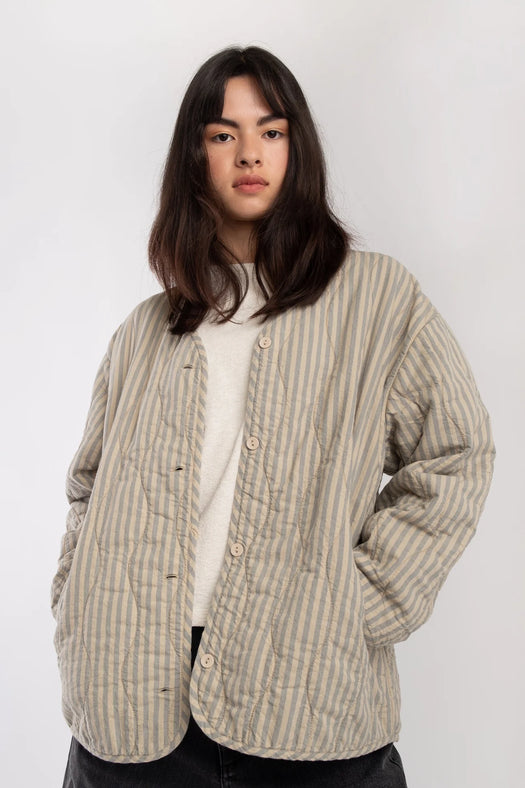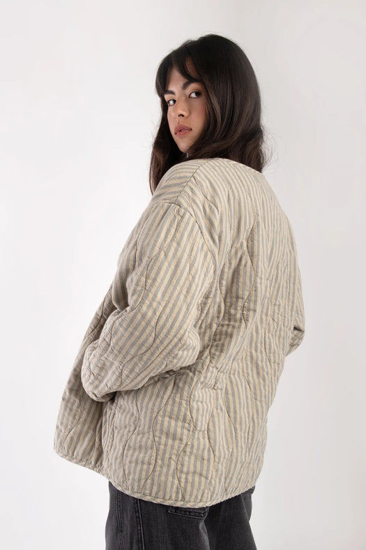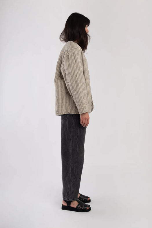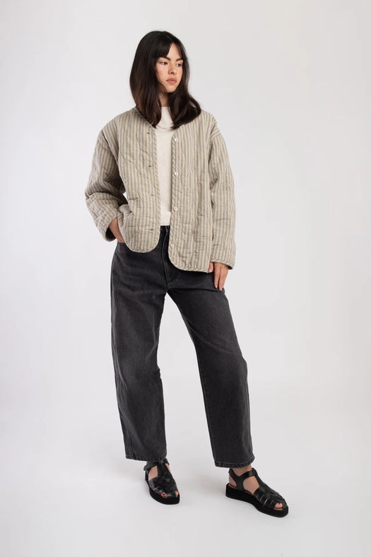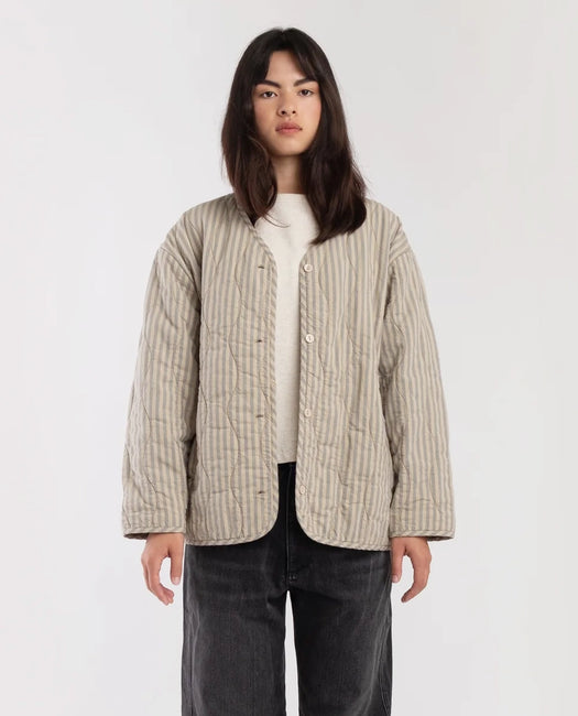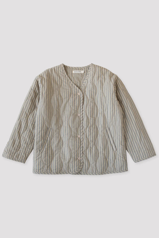 Lightweight, relaxed fit quilted jacket with wave stitch pattern in beautiful organic cotton voile. Jacket features side welt pockets, v-neck and button front closure.