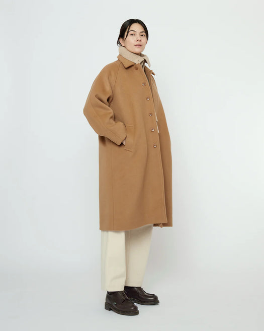 A classic mid-length wool overcoat. This is the wool version of 7115's Signature Duster Coat. Features a pointed collar, straight hem, concealed placket, raglan sleeves, and two front welt side pockets. Cut with a boxy fit.