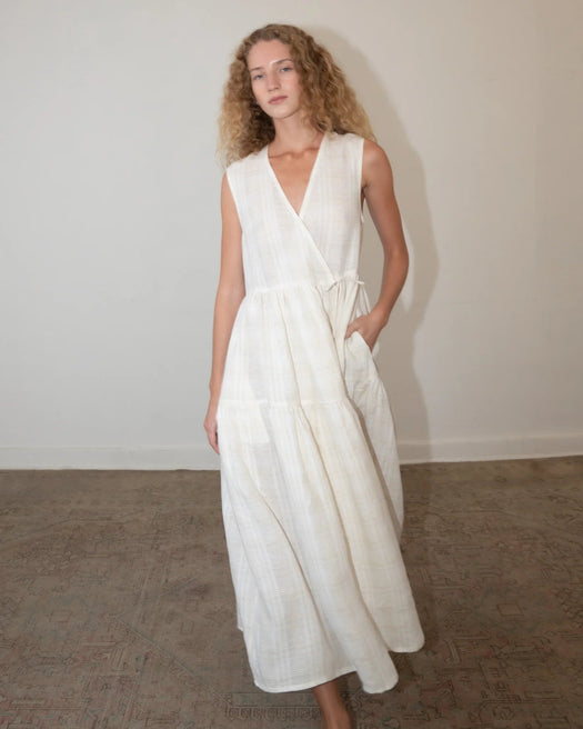 The Blanche Dress is a dreamy, billowy, three tiered dress featuring delicate ties inside and outside. It is made with a special, monochromatic plaid and wraps for a deep v-neck.