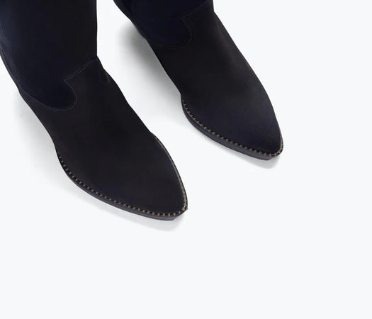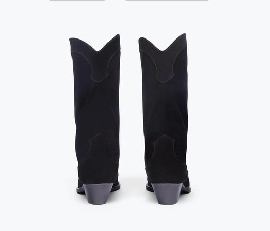 The city-dweller cowboy boot. Handcrafted in black suede, the Loretta nods to a classic Western style with the pointed toe, angled heel and leather notched welt. The ease of its pull-on entry makes it an effortless option for roaming city streets in everyday dresses or cutoffs.