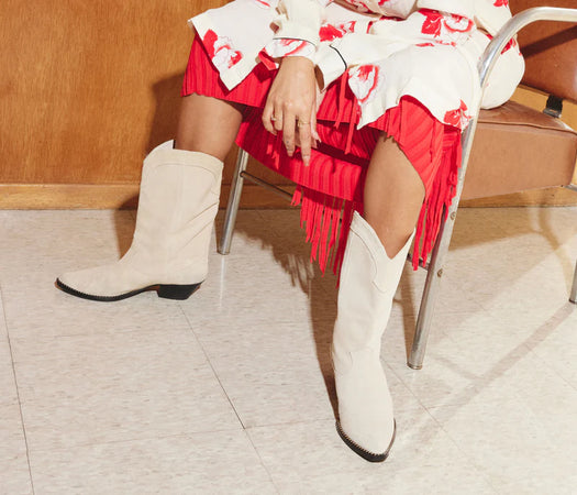The city-dweller cowboy boot. Handcrafted in a bone suede, the Loretta nods to a classic Western style with the pointed toe, angled heel and leather notched welt. The ease of its pull-on entry makes it an effortless option for roaming city streets in everyday dresses or cutoffs.