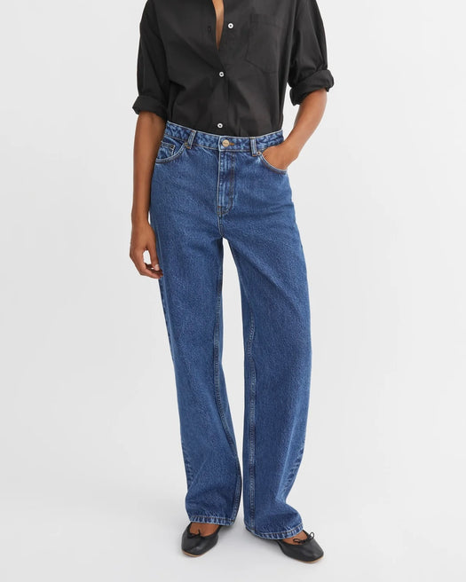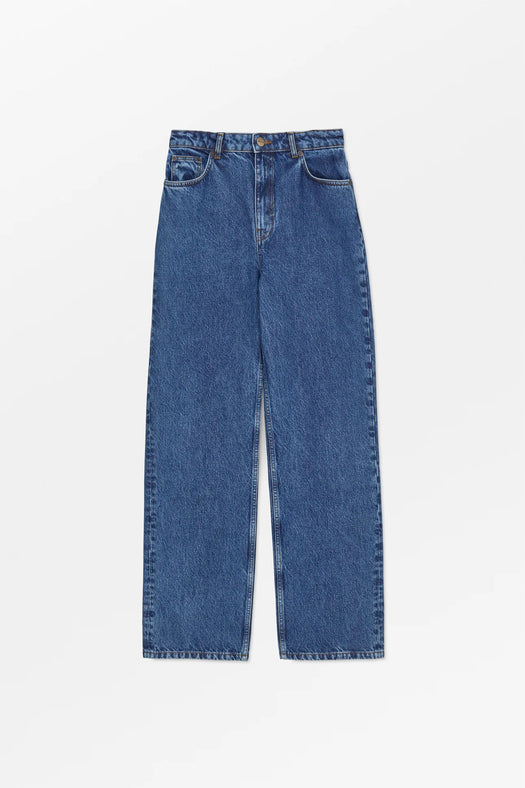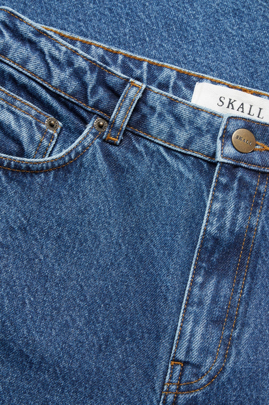 A straight jean in lightweight organic cotton from Skall Studio’s GOTS certified denim line. The straight leg regular length jeans have a high waist, a classic five pocket design and belt loops. On the back of the waistband, they feature an embroidered SKALL logo.