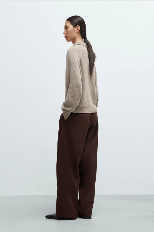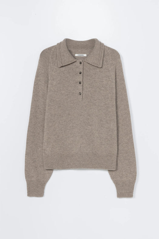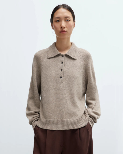 This staple oversized polo sweater is crafted from the softest Merino wool. It features a long-sleeve silhouette with a relaxed fit, a polo collar, and a four-button placket. Ribbed finishes at the cuffs, hem, and collar add subtle texture. A timeless essential designed for effortless layering.