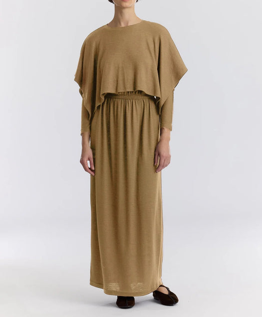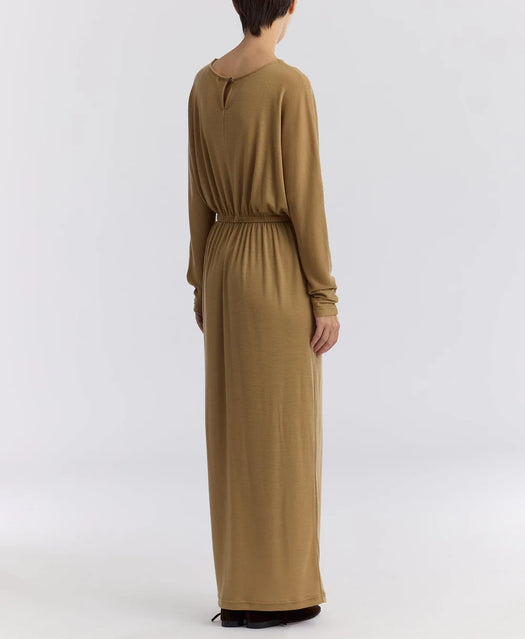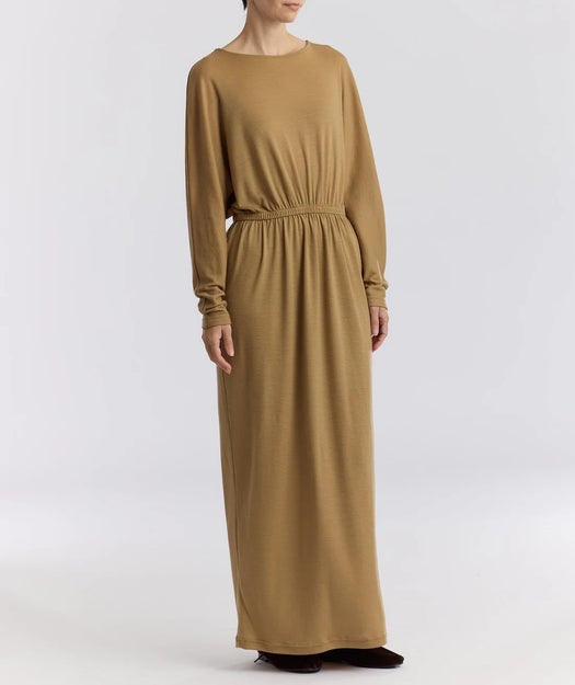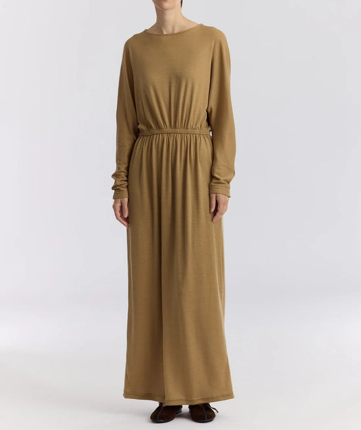 A relaxed dress with a basic crew neck and single button closure at the back neck. Features an elastic waist and dolman sleeve.