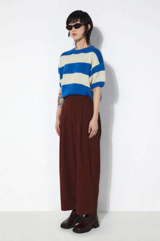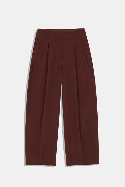 Corduroy balloon pants. High-waisted style with zipper closure, hidden button and hook-and-eye closure. Extra wide legs, slightly tighter at the hem, with front pleats, side bias pockets and inset back pockets.