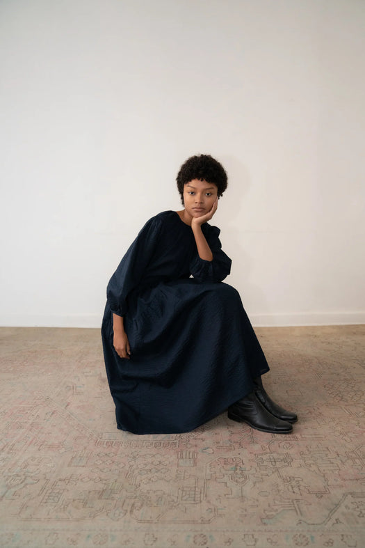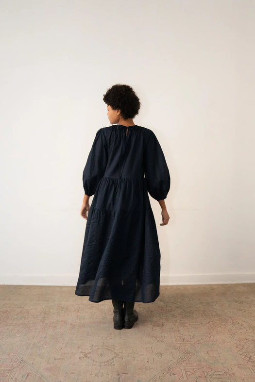 The Nella is cut in textured cotton with a subtle sheen. Oversized in shape, it falls in three gathered tiers with volume through the body. Finished with a tie closure at the back neck.